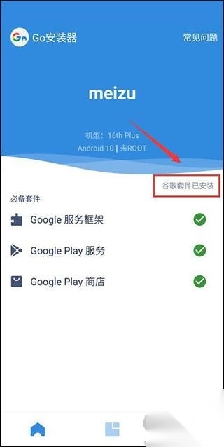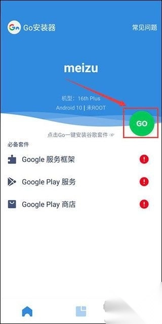 1、自动检测与下载:打开软件后会自动检查谷歌三件套的安装状态。未安装的组件会在后方显示红色感叹号标记。只需点击右侧的绿色GO按钮,等待下载完成即可。