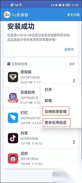 2、手动安装步骤:下载完成后需要手动安装。安装前需授予软件以下权限:读取应用列表权限、允许安装未知来源应用权限,安装成功后界面会显示"谷歌套件已安装"提示。
