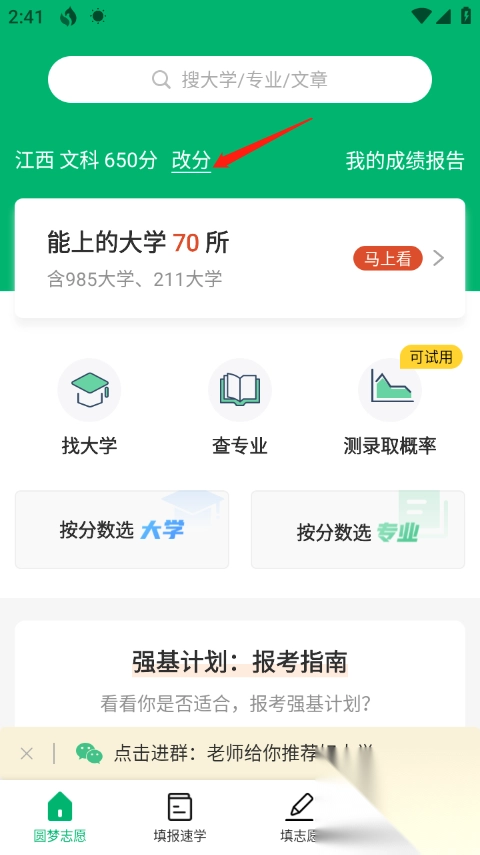 1、下载安装后登录,进入圆梦志愿页面后点击搜索框下方的改分。