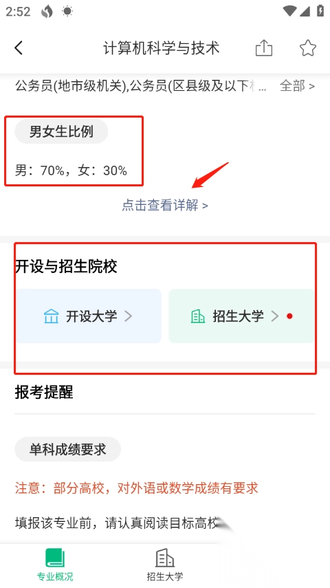 4、然后进入详情页面,在这里可以全方面的了解这个专业,从男女比例,未来就业到开设与招生院校都可查看到
