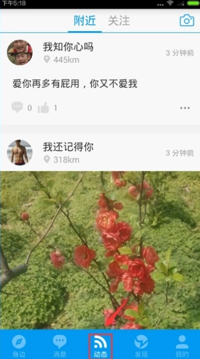 4、进入动态页面,即可查看附近朋友和你关注的朋友最新的动态。