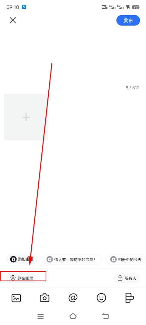 2、在内容页编辑完自己想要发布的内容后,点击打开下图所示位置“你在哪里”