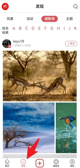 2、点击“发现”标签,浏览用户上传的最新风景摄影作品。