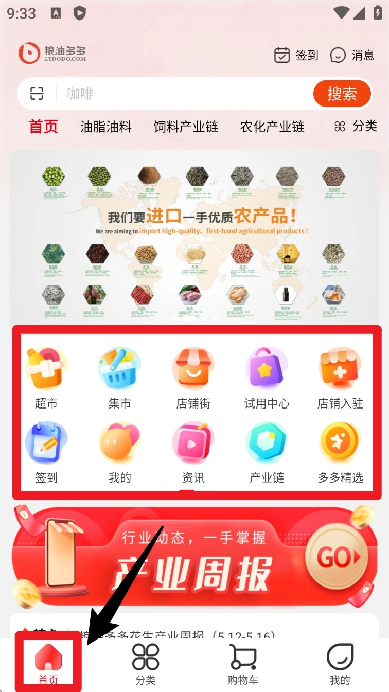 1. 打开 App 进入首页,点击上方图标区进入“超市”、“集市”、“店铺街”等功能入口。