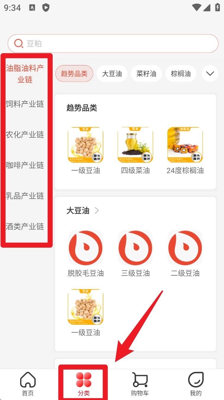 4. 点击底部“分类”按钮可进入行业分类页,按产业链或品类快速查找目标产品。