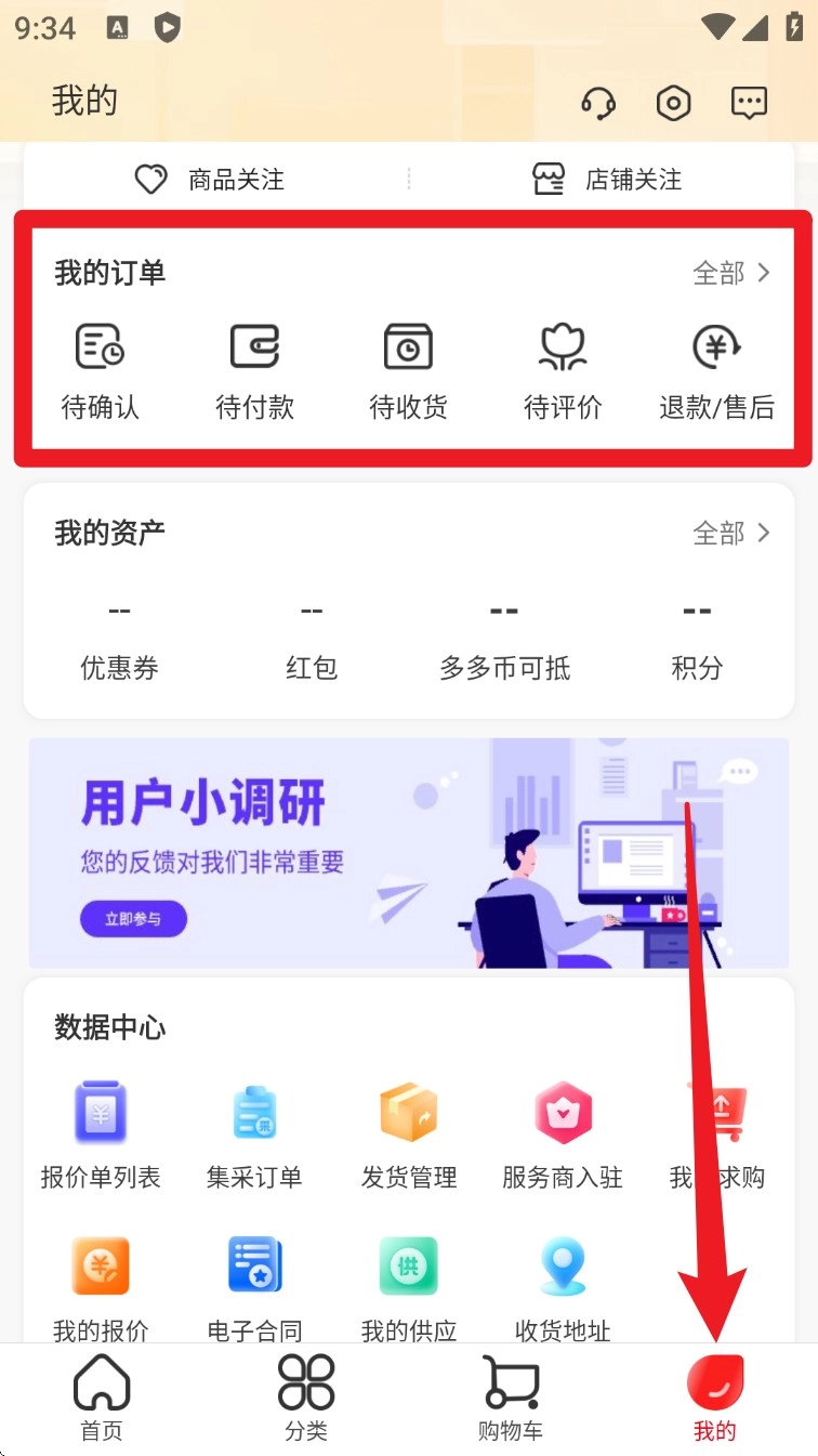 5. 在“我的”页面可查看订单进度、发货状态、资产信息与数据中心等多项服务。