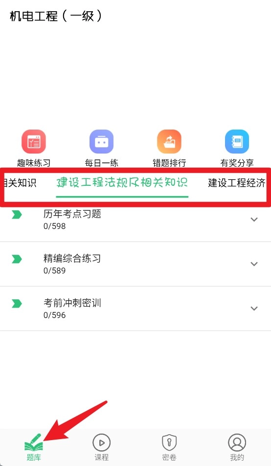 4. 在“题库”的首页,能够进入机电工程相关知识的练习板块。这里分类明确,涵盖了考试的重点内容。