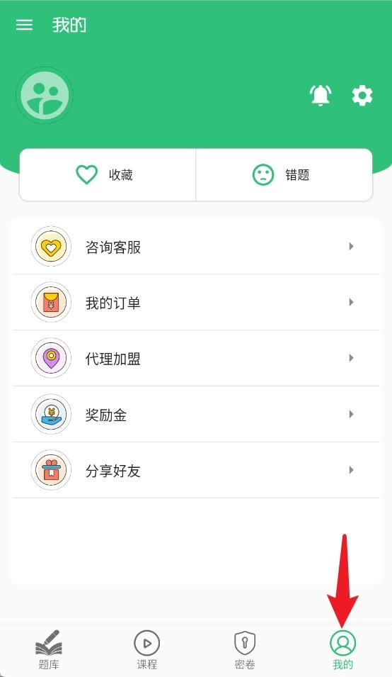 3.点击“我的”页面,可查看收藏题、错题记录及订单信息,方便学习管理与进度跟踪。