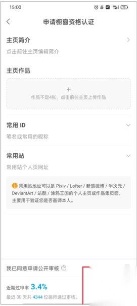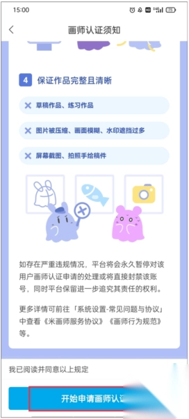 2、阅读完画师认证须知之后,勾选“我已阅读并同意以上规定”,开始申请画师认证。