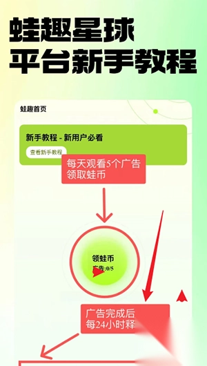 蛙趣星球APP是一个通过做任务就能赚钱的平台。在这个平台上,你能完成大量任务来赚取收益,平台支持每日看广告赚钱、推广赚钱,还有各类试玩任务也能赚钱。在这里,每个人都有机会获取蛙币,而蛙币可直接兑换红包奖励并提现。