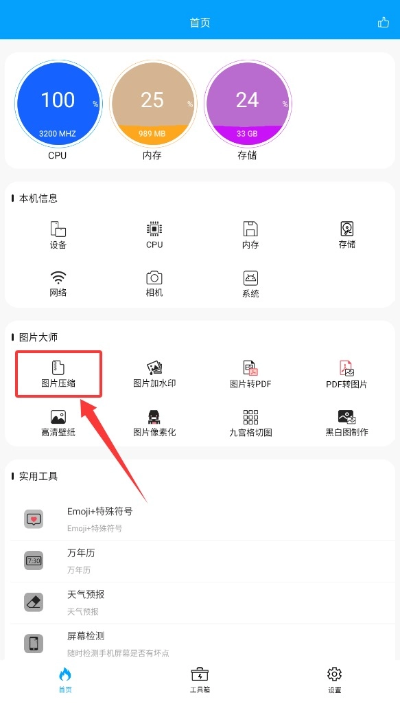 2、进入APP主界面后,在工具分类中找到"图片压缩"功能图标,点击即可进入图片处理界面。