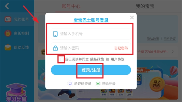 输入手机号,密码,我已阅读并同意 隐私政策和用户协议,点击登录/注册即可
