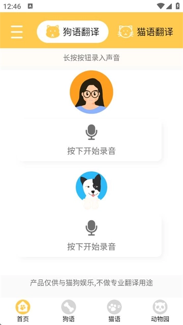 即刻语言转换:无论是猫咪还是狗狗,用户的声音都能即时转化为对应的猫语或狗语,让宠物更愿意与你亲近。