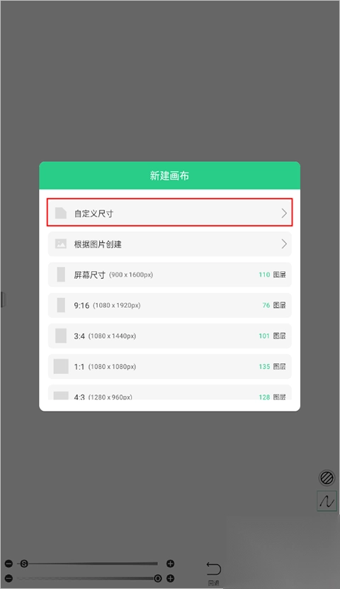 3、这时页面会弹出一个新简画布的窗口,选择“自定义尺寸”即可自由创建画布大小啦。