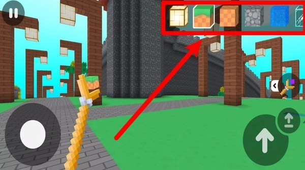 3.上方的方块和工具栏可快速切换不同的建造材料与装备,让玩家在建造或战斗时灵活调整策略。