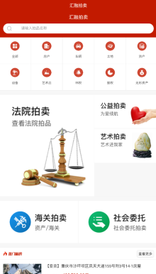 1. 打开汇融拍卖APP,首页呈现司法拍卖、资产处置等各类拍卖类型的入口。