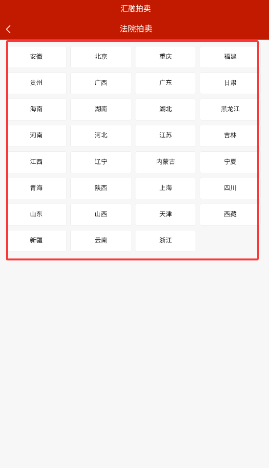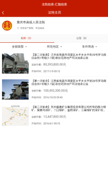 2、当选择“法院拍卖”功能后,能够依据省份、城市对目标区域的拍卖标的物进行筛选。