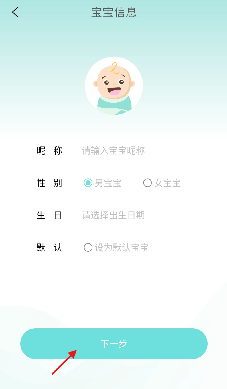 3、依次填写宝宝昵称、性别、出生日期等信息,点击 “下一步” 完成创建。