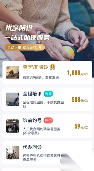 优享陪诊app,这是一款能陪伴用户前往医院进行检查、提供就医陪同服务的软件。用户只需在软件内下单,便会有专业陪诊人员为您服务。这些专业陪诊人员不仅熟知医院的特色技术、设备力量、地理环境,还对各个科室的就诊范围、专家情况、专业特色,以及住院前后的各项手续和报销政策等都了如指掌。有需要的朋友,赶快下载安装吧!