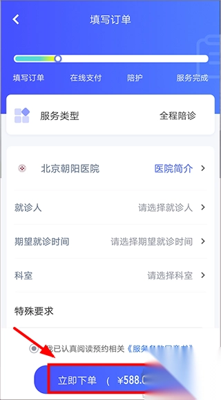 4、然后填写就诊人信息,及就诊科室等信息,如有特殊需要也可在下方备注。填写完成后,点击【立即下单】完成支付即可;