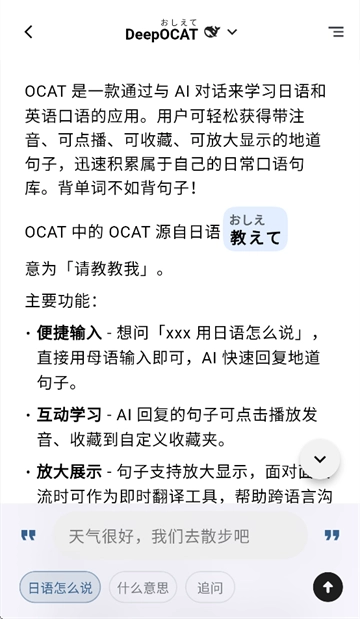 OCAT是一款借助与AI对话的方式,助力用户学习日语和英语口语的应用程序。使用者能够便捷获取带有注音、支持播放功能,并且可以进行收藏与放大显示的地道语句,从而快速积累起专属于自己的日常口语句库。