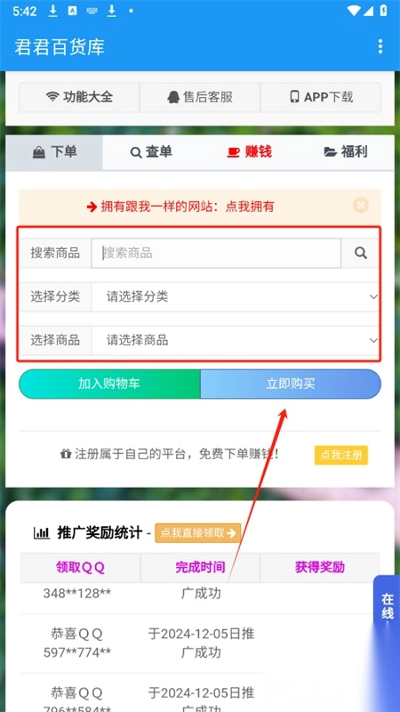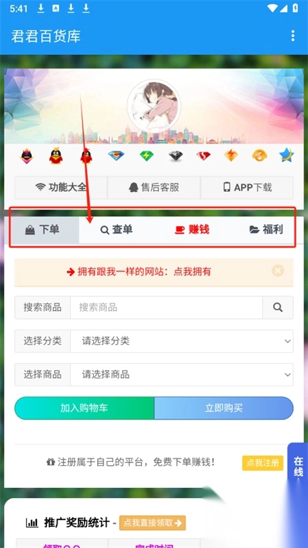 君君百货库最新版本可免费下载,这是一个十分出色的推广做任务平台。借助该平台,你既能享受优惠的购物福利,又能通过推广来赚钱,并且操作相当简便。填好相关信息后,就能迅速生成你的专属推广链接,把链接分享给朋友或发到其他群聊,只要有人访问点击,你就能获得指定商品奖励,轻松赚取零花钱。感兴趣的朋友们,快来下载吧!