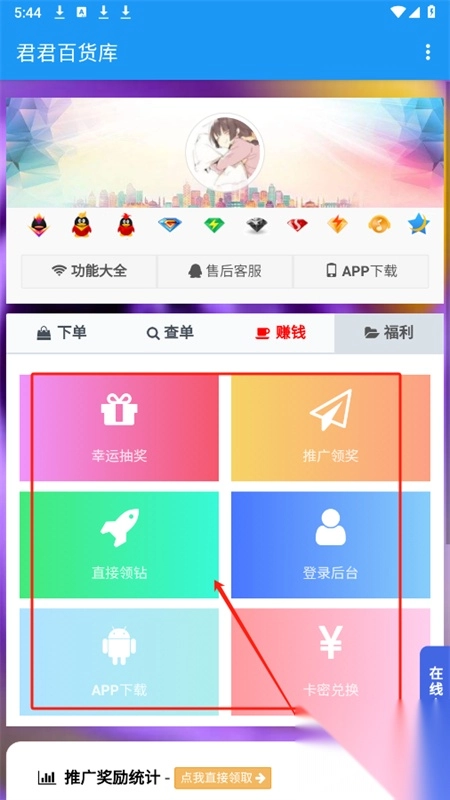 5、福利页面为大家准备了幸运抽奖、推广领奖、卡密兑换等福利项目。