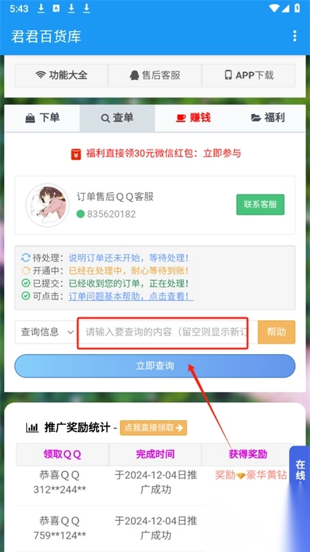 2、打开进入主页后,可以看到下单、查单、赚钱、福利等功能