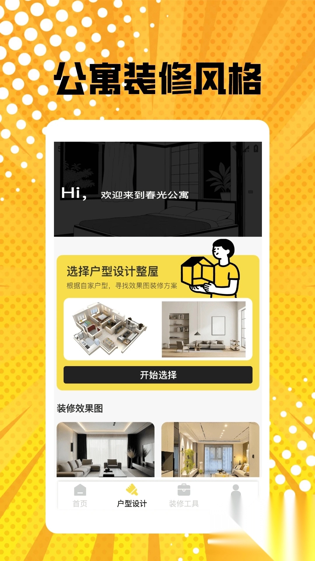 2、于房型设计页面,能够挑选户型来开展整屋设计,与此同时还能知悉装修效果图等相关信息。
