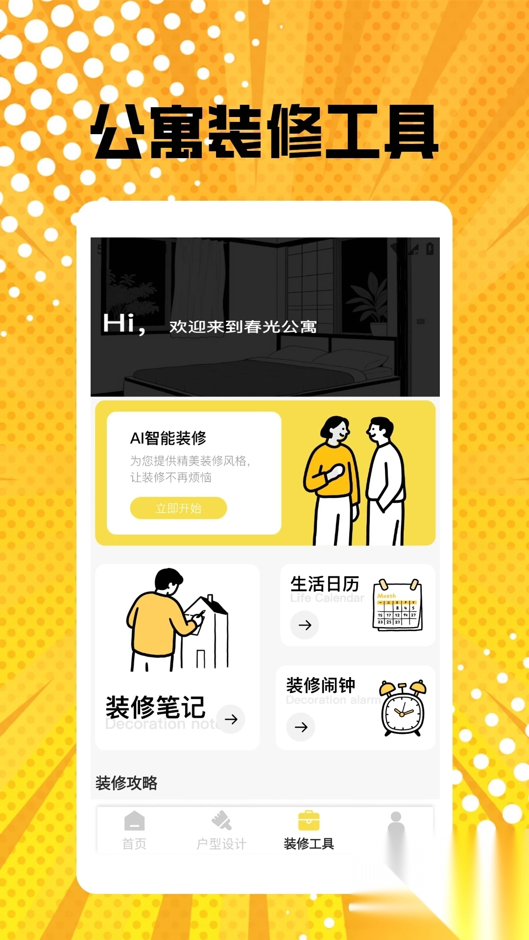 3、装修工具页面涵盖了ai智能装修、生活日历、装修闹钟以及装修笔记等内容。