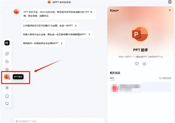 5、然后打开Kimi,在左侧栏目里,点击选择【PPT助手】;