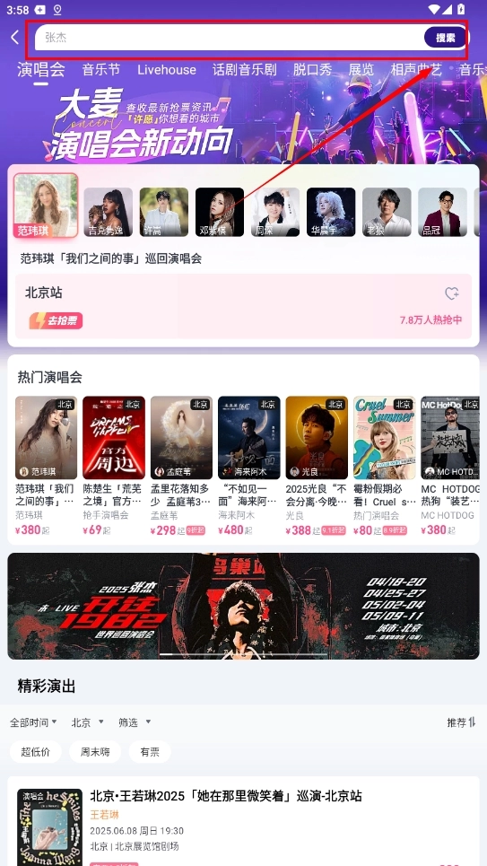2、通过顶部搜索栏输入演出名称或艺人关键词,快速查找目标场次信息。