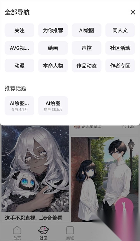 4、切换到社区,这里有众多你感兴趣的话题,例如ai绘图、声控、绘画、动漫等。