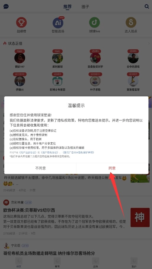 1. 当首次启动球球是道APP时,系统会呈现服务条款与隐私政策,认真阅读完毕后,点击“同意”按钮即可进入主界面。