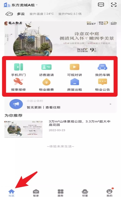 2. 社区页面整合了开门、访客邀请、可视对讲等服务,为住户的日常生活管理与出入控制提供便利。