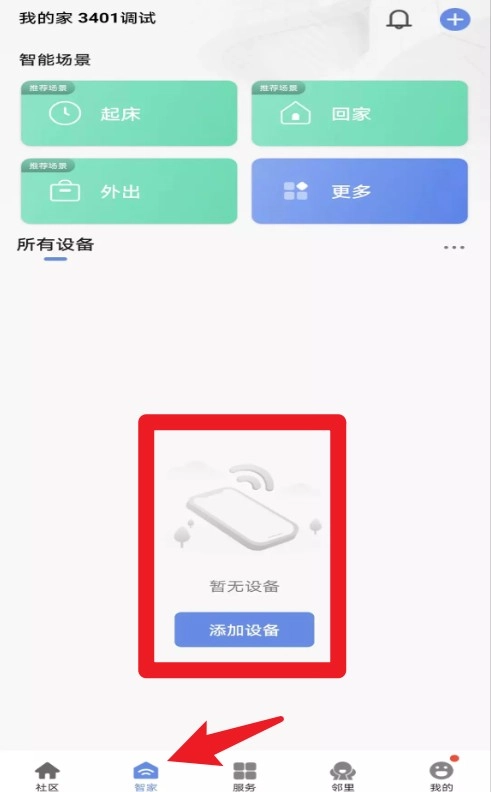 3、智家模块可添加和管理智能设备,提供起床、回家、外出等场景控制功能。