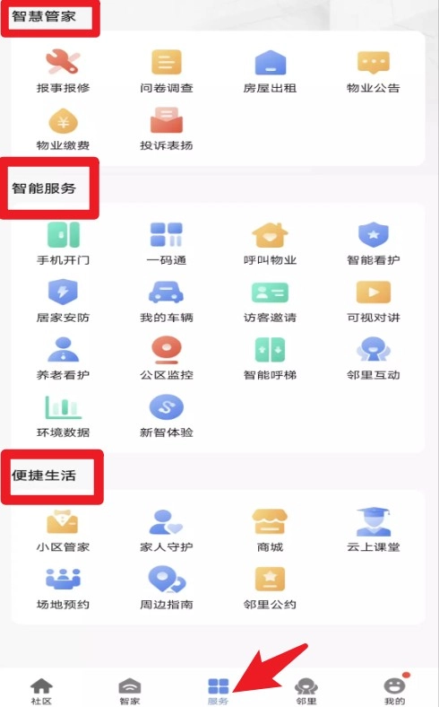 4、服务页面分类清晰,包含智慧管家、智能服务以及便捷生活等类别,并提供物业缴费、车辆管理等综合功能。