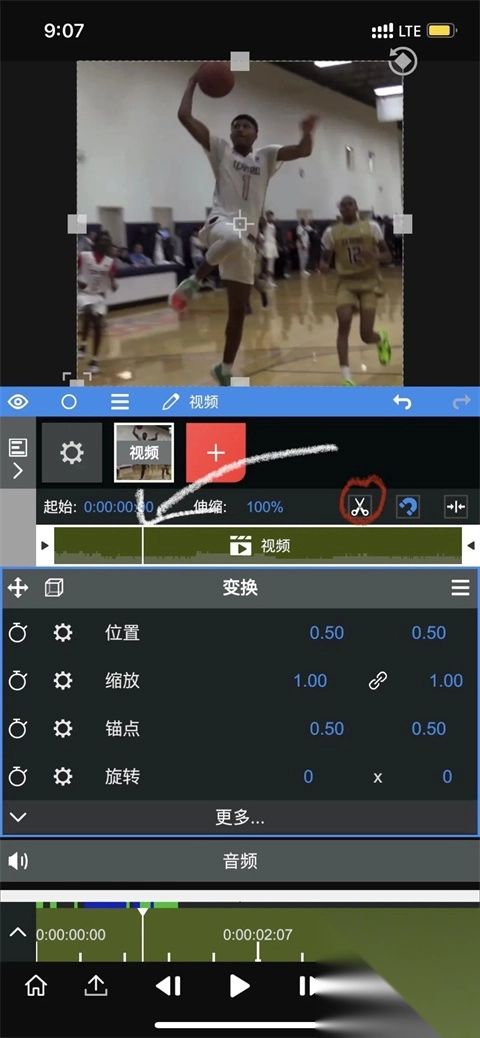 6、拖动进度条,在你期望补帧的位置进行剪切,剪切按钮就是红色圆圈所圈住的剪刀图标。