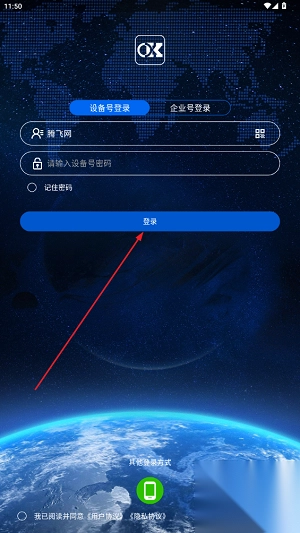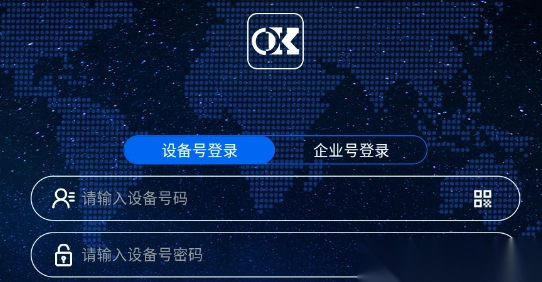 1、打开欧克物联app,在相应位置输入个人设备号码与密码,完成登录操作。