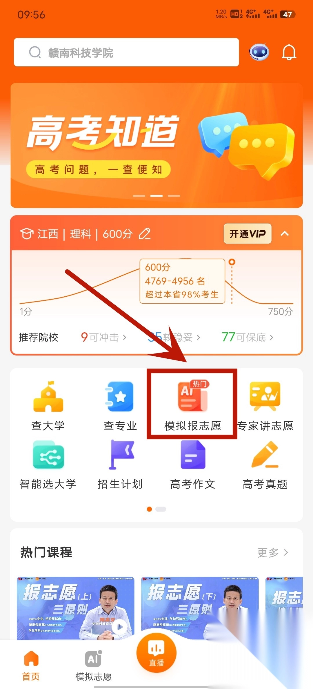 2. 完成填写后,回到应用主界面,点击【模拟填志愿】,便能开启AI志愿填报一站式服务平台。