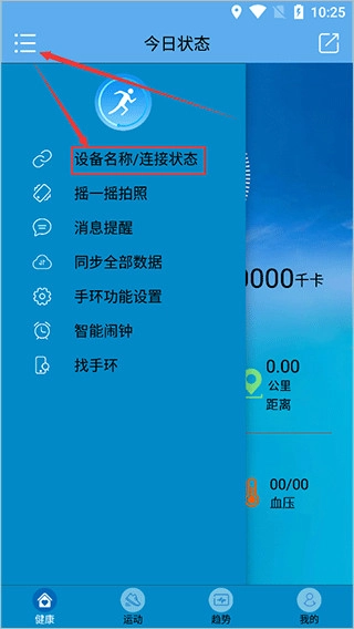 1. 于本站即刻打开Fithere软件,进入首页后,点击左上角的三横按钮,接着选择“设备名称/连接状态”进入。