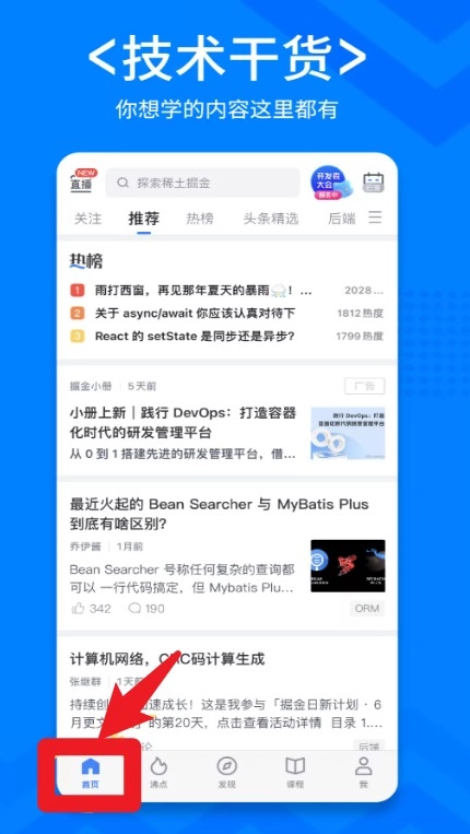 1、“首页”模块聚合技术干货内容,涵盖编程、架构、职场等热门话题,适合开发者持续学习。