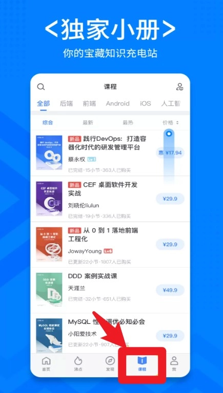 3、“课程”页面提供独家小册,按前后端、AI等分类售卖精品技术课程,适合按需选修充电。