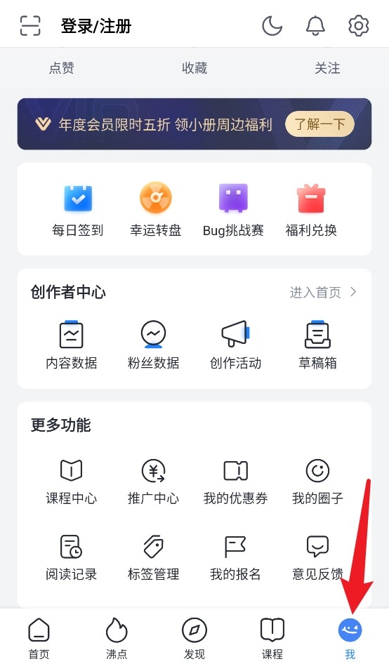 4、“我”页面整合签到、任务、权益与创作中心,便于管理个人资料、优惠券及学习记录。