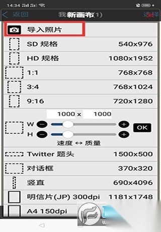 2、在新建画布处,选择导入照片。