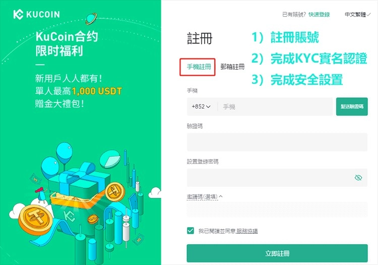 1)用手机或邮箱注册KuCoin账号。