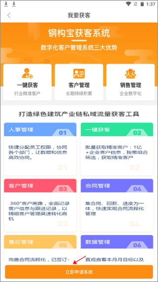 2、此时便能看到获客系统的功能介绍。按照指引开启该系统后,即可运用管理客户、管理合同等功能。请点击下方的“立即申请系统”按钮。