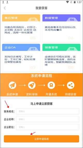 3、填入联系姓名、企业名称等相关信息,接着再次点击下方的“立即申请系统”按钮,即可获取该系统。