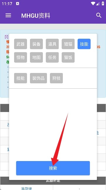 4、接着点击左上角的【三】按钮,在此处能够切换频道,比如【武器、装备、道具、猎猫、技能、怪物、地图等】 。