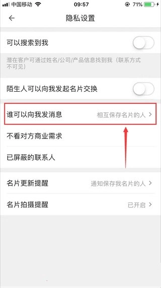 3、在隐私设置页面里就可以看到 陌生人可以向我发起名片交换。
